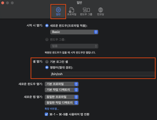 여기서 Shell path를 /bin/zsh로 적어주면 됩니다.