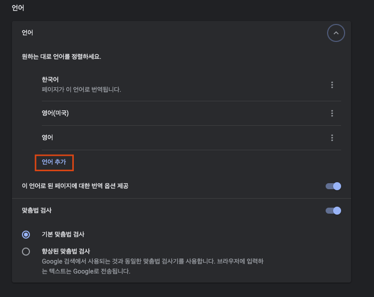 그러면 위 같은 화면에서 언어 부분에서 언어 추가 버튼을 이용해 원하는 언어를 추가할 수 있습니다.