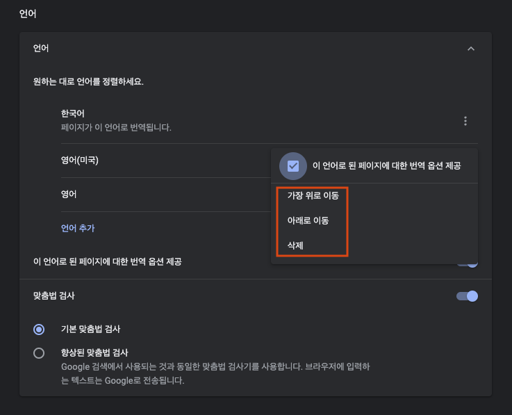 가장 상단에 있는 언어가 Chrome의 기본 언어가 됩니다.