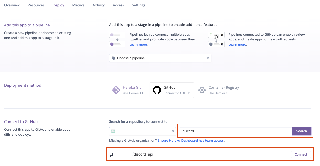그러면 이제 저희 github에서 discord_api라는 repoistory에 Heroku가 접근할 수 있도록 연결을 합니다.