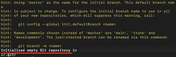 그러면 위 화면처럼 비어있는 git repository가 initialize되었다는 메세지가 뜹니다.