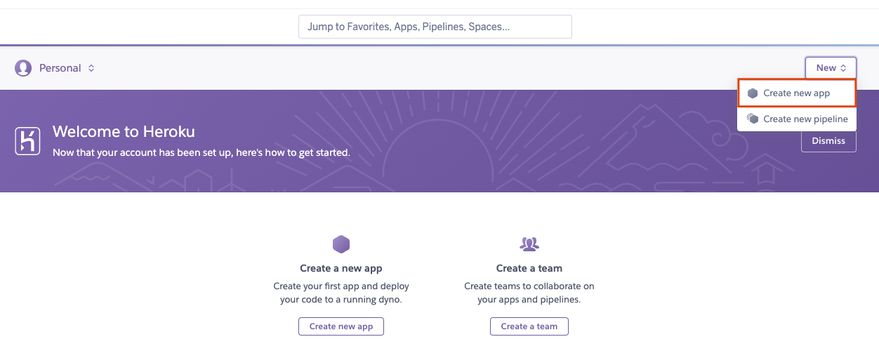 (Heroku 홈페이지의 개편 등에 의해 Create new app 버튼의 위치는 좀 다를 수 있습니다.)