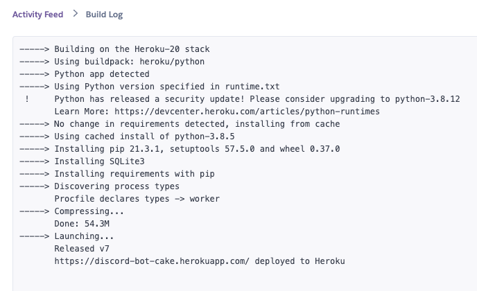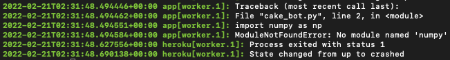 [terminal] $ heroku logs -a discord-bot-cake