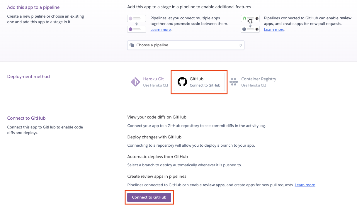 App을 생성하는 화면에서 Github을 클릭한 후 Connect to Github 버튼을 눌러줍니다.