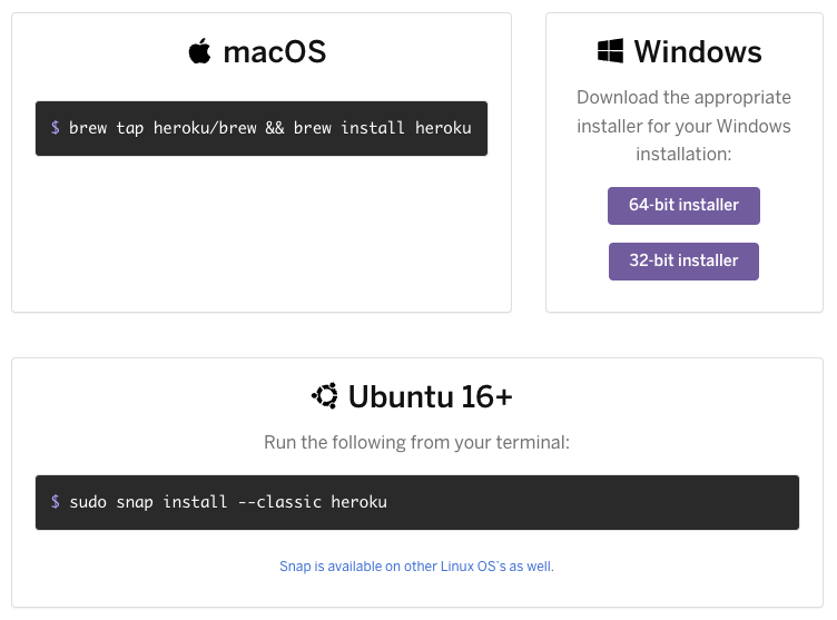 그러면 아래와같이 각 운영체제별로 어떻게 Heroku를 설치할 수 있는지가 나와있습니다.