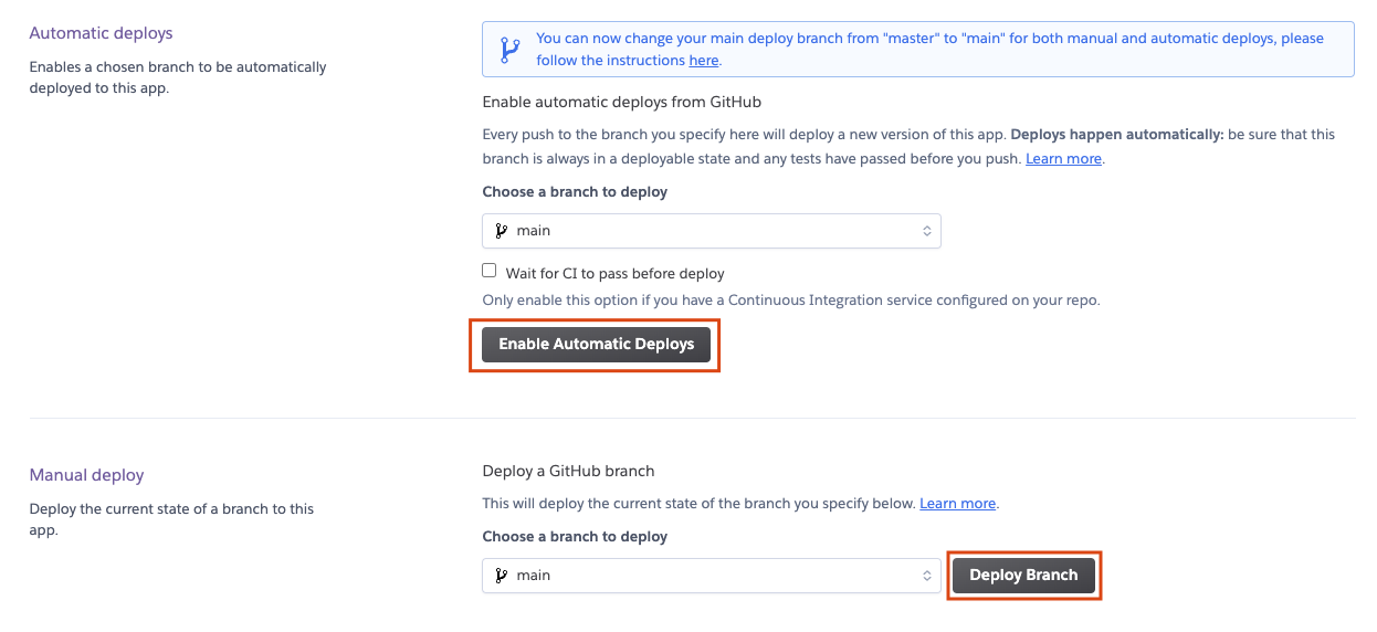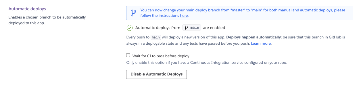 Enable Automatic Deploys는 아마 연결된 github에 코드/파일의 번화가 있으면 자동으로 deploy하겠다는 의미인 것 같습니다.