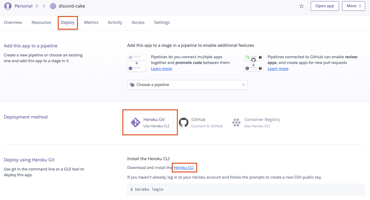 Deploy 탭으로 진입한 후 Heroku Git을 선택하면 Heroku CLI 다운로드 링크를 볼 수 있습니다.