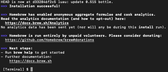 terminal에서 위 brew 설치 명령어를 입력하면 아래와같이 Command line에서 brew를 사용할 수 있는 툴들을 다운로드 받습니다.