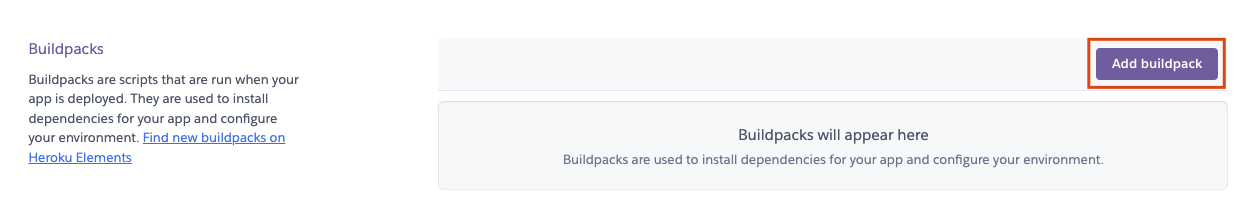 Settings 화면에서 스크롤을 내려보면 Add buildpack이라는 버튼이 있습니다.
