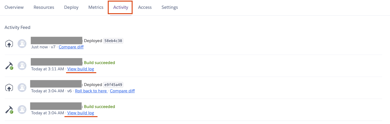 그러면 위처럼 내가 github에 push해서 뭔가 변화를 주어 Automatic deploy가 된 내역, 그리고 각각의 Automatic deploy에 대한 log 등을 볼 수 있습니다.
