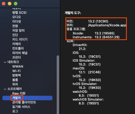 그러면 좌측에 개발자 메뉴가 있고 여기서 개발자 도구에 /Applications/Xcode.app의 버전이 13.2로 제대로 설치된 것을 볼 수 있습니다.