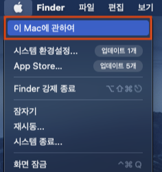 좌측 상단에 사과모양을 클릭해서 이 Mac에 관하여 메뉴로 들어갑시다.