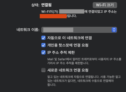 그러면 현재 연결된 인터넷(Wi-Fi, LAN 등)의 IP 주소가 빨간색 네모칸에 표시됩니다.