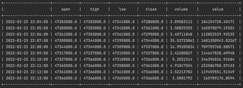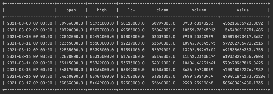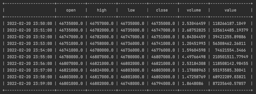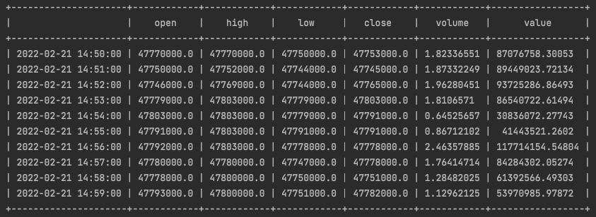 위 내용을 이해하면 아래 예시처럼 to='20220221 23:00:00' 로 설정해도 결국 2022-02-21 09:00:00 데이터가 가장 최신 데이터로 추출되는 것이 이해될겁니다.