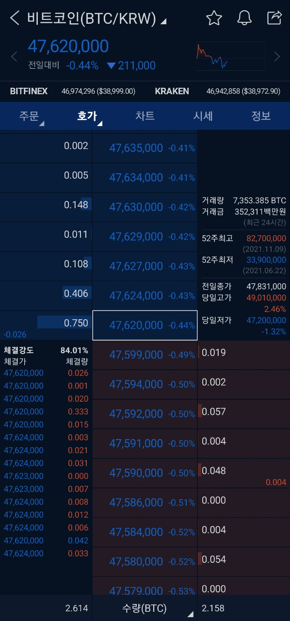 매도 호가(매도 예약)를 좀 더 정확히 말하면 47,620,000원으로 매도 예약을 해뒀을 때 무조건 비트코인 가격이 47,620,000원일 때 팔리는건 아닙니다.