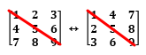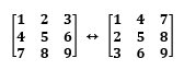 위 이미지를 보시면 화살표 왼쪽에 있는 행렬과 오른쪽에 있는 행렬은 서로 전치 행렬 관계입니다.