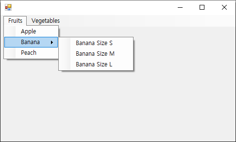 따라서 Banana라는 이름을 가진 ToolStripMenuItem에 DropDownItems.Add method를 이용해서 드롭다운 메뉴를 추가하면 됩니다.