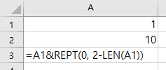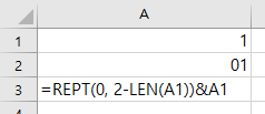 즉, REPT 함수를 통해 0을 반복시키는데 그 반복 회수를 2-LEN(A1) 이렇게 지정하여 2글자에서 이미 존재하는 글자수를 빼서 반복 횟수를 정합니다.