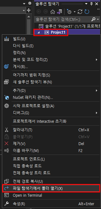 여기까지 찾아가기 귀찮으니 우측 솔루션 탐색기에서 프로젝트를 우클릭하면 아래와 같은 메뉴가 나오는데 여기서 '파일 탐색기에서 폴더 열기'를 클릭하면 프로젝트 폴더를 열어줍니다.