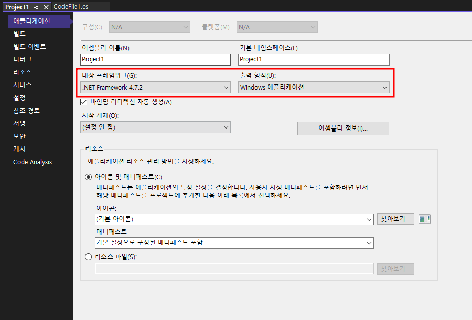 기본값은 콘솔 애플리케이션으로 되어있을 것입니다. 기본값이 콘솔 애플리케이션으로 되어있기 때문에 우리가 코드를 실행했을 때 콘솔 창이 뜨는 것입니다.