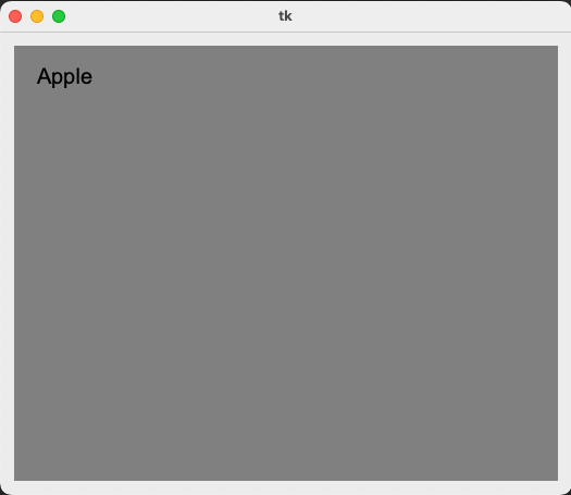 canvas.create_text(50, 30, text='Apple', fill='black', font=('Arial', 20))