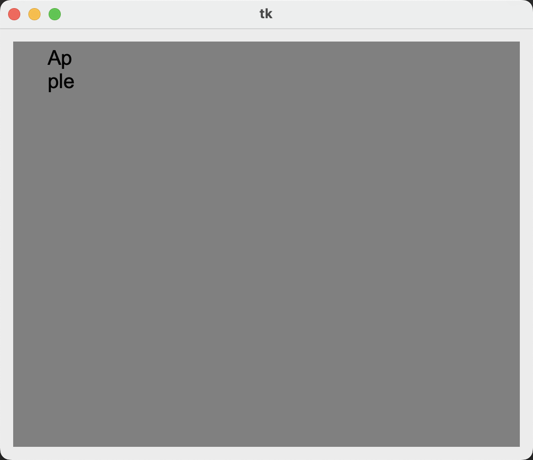 canvas.create_text(50, 30, text='Apple', fill='black', font=('Arial', 20), width=30)