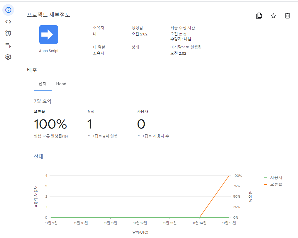 이 화면은 해당 프로젝트의 세부 정보와 프로젝트가 실행된 횟수, 오류율 등 프로젝트의 현황에 대한 여러 정보를 보여줍니다.
