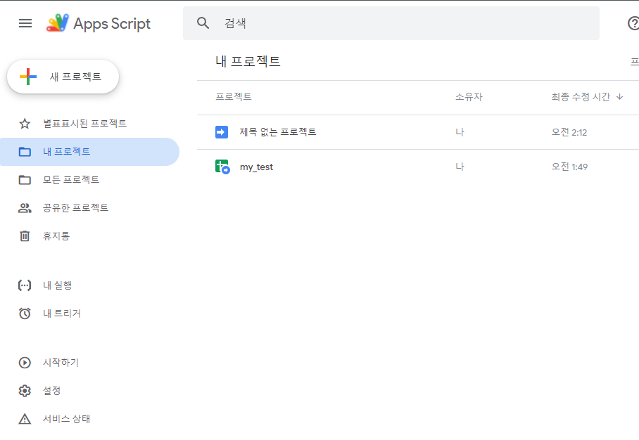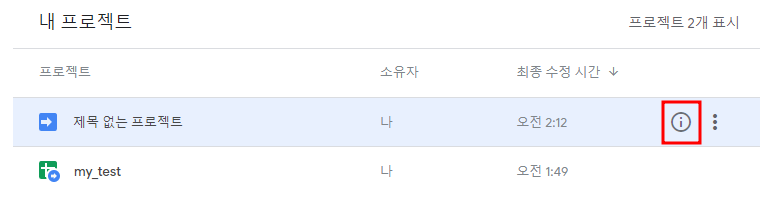 따라서 Google Drive의 driectory로 가봐도 생성한 스프레드시트만 보일 뿐 Code.gs 파일이나 다른 프로젝트 자체는 보이지 않습니다.