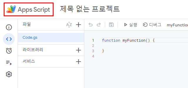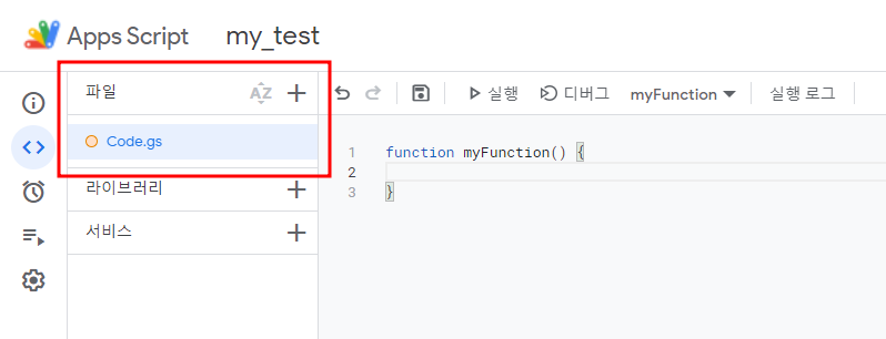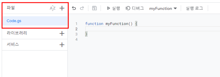 위 이미지의 빨간색 사각형으로 표시된 부분을 보면 Code.gs 파일이 있죠.