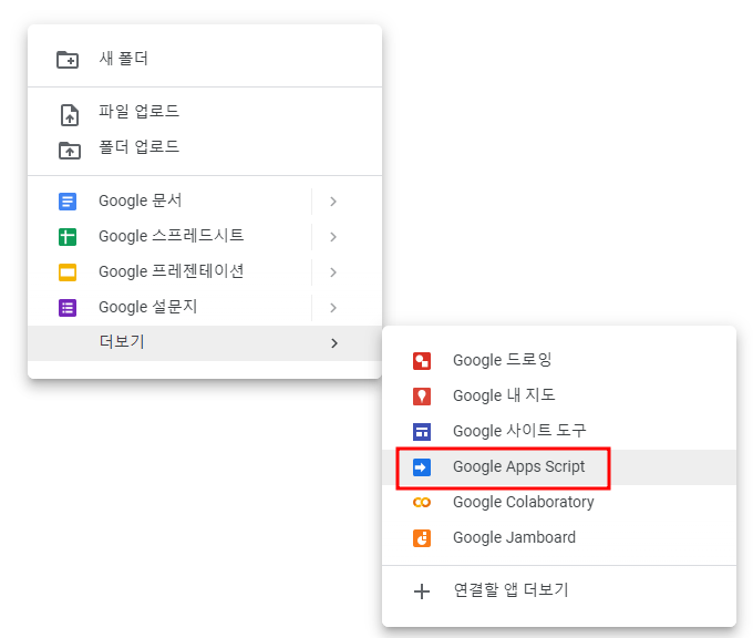 Google Drive에서 우클릭을 한 후 아래처럼 Google Apps Script를 눌러봅시다.