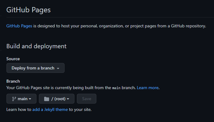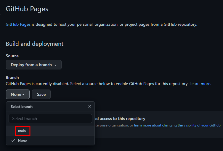 여기서 Branch 메뉴에서 None을 main (또는 master)로 바꿔주고 Save 버튼을 눌러줍시다.