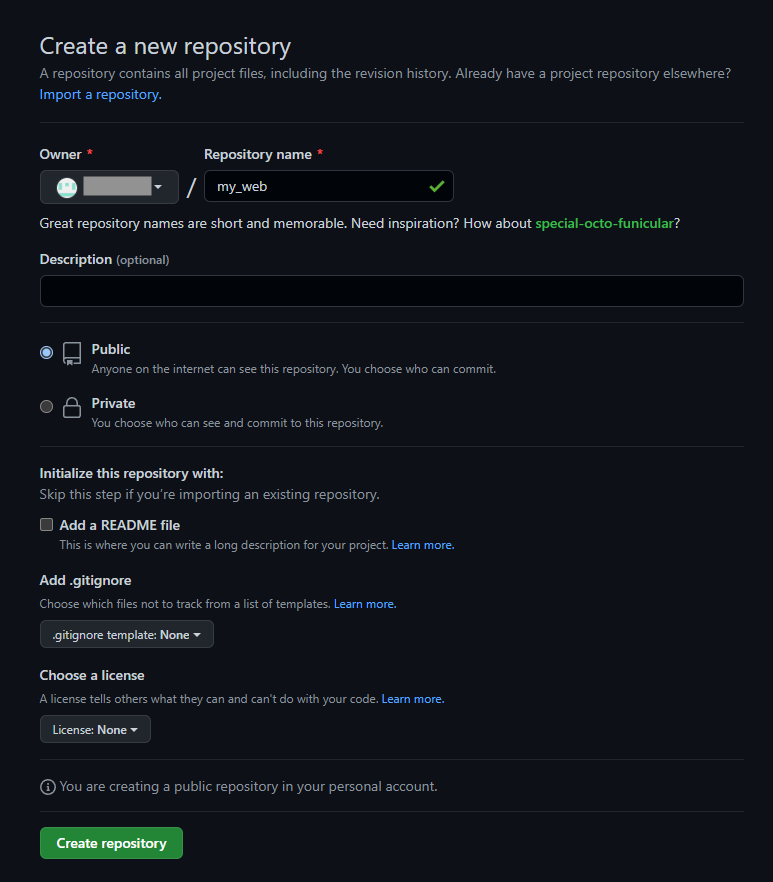 먼저 저는 my_web이라는 이름의 repository를 만들었습니다.