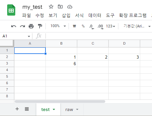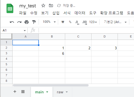 현재 my_test라는 spreadsheet를 만들어놨으며 여기에는 main, raw라는 2개의 sheet가 있습니다.