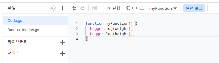 여기서 Code.gs는 myFunction이 있는 파일이며 main 함수의 코드를 담은 파일입니다.