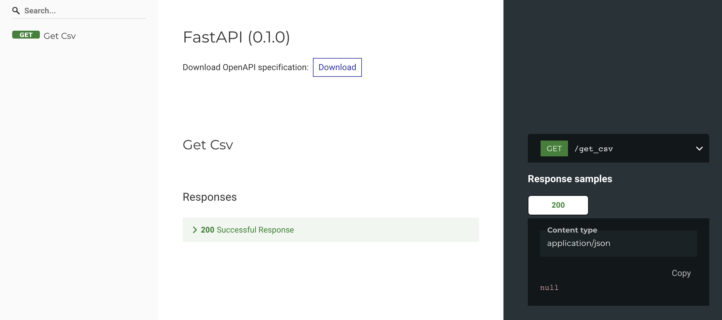 FastAPI에서 했던 것 처럼 csv 파일을 return해주는 API를 작성해보았습니다.
