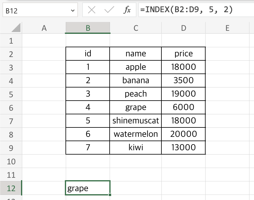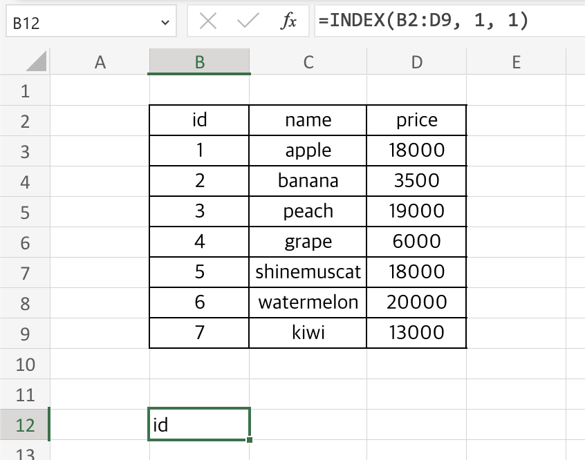 B12 셀에는 index함수가 입력되어있고 id라는 값이 표시되고 있습니다.