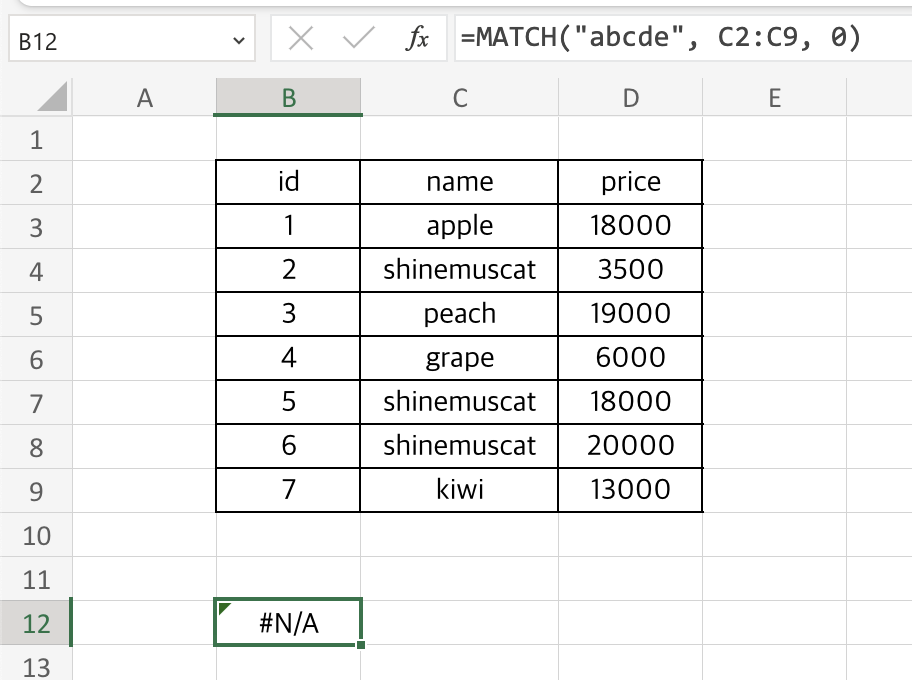 abcde라는 값을 C2:C9 범위에서 찾아야하는데 abcde라는 값은 C2:C9 범위에 존재하지 않습니다.