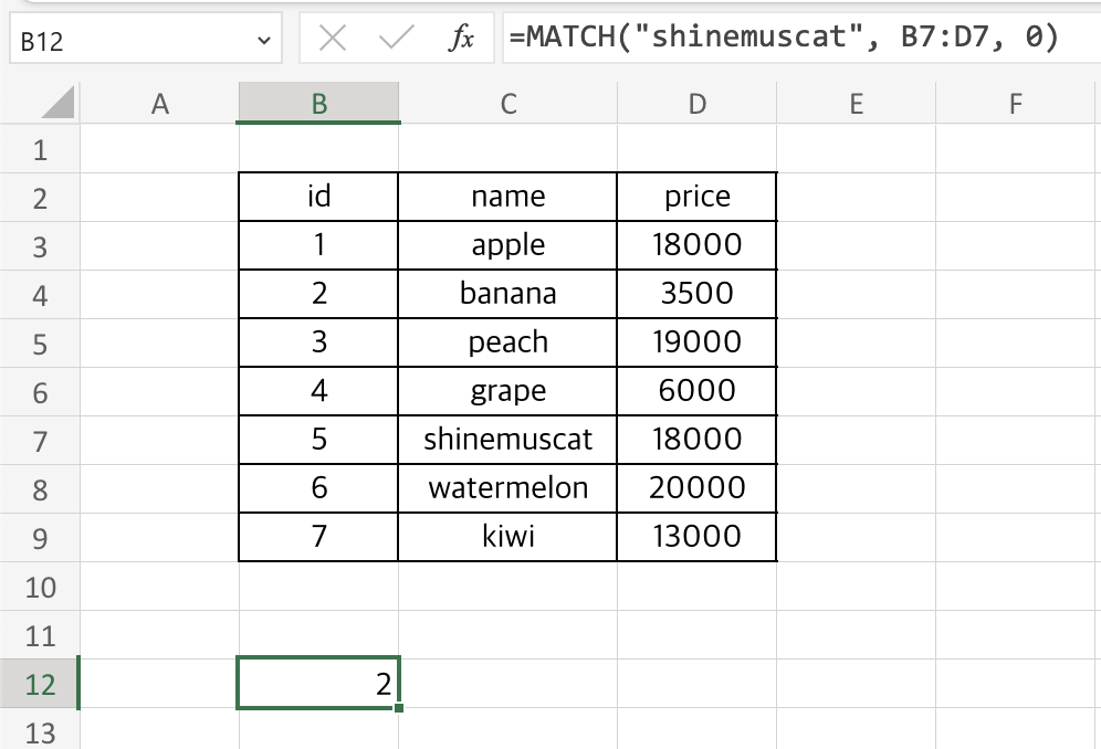 그러면 shinemuscat이라는 값은 두 번째 셀에 있으므로 2가 return됩니다.
