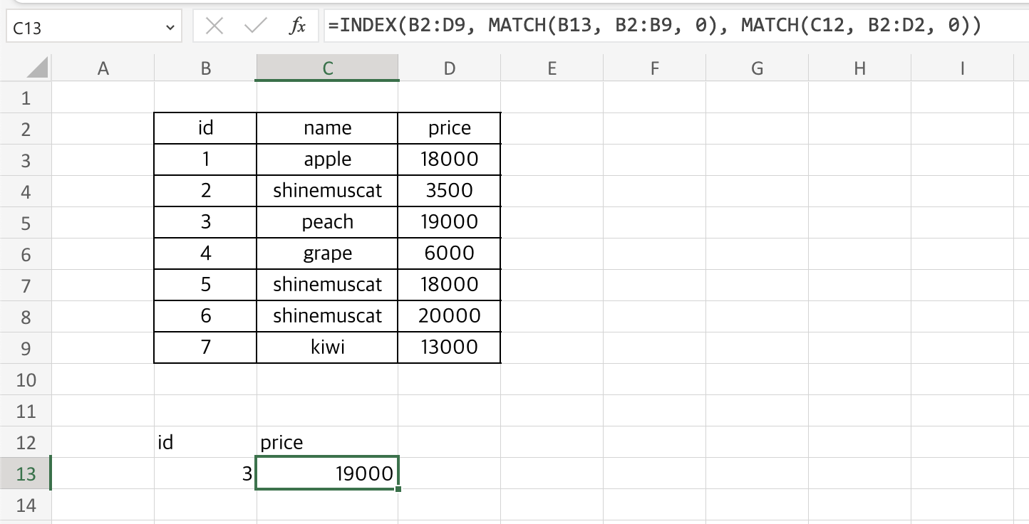 =INDEX(B2:D9, MATCH(B13, B2:B9, 0), MATCH(C12, B2:D2, 0))