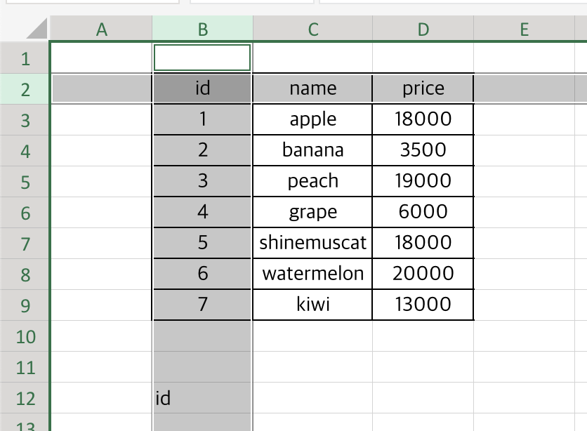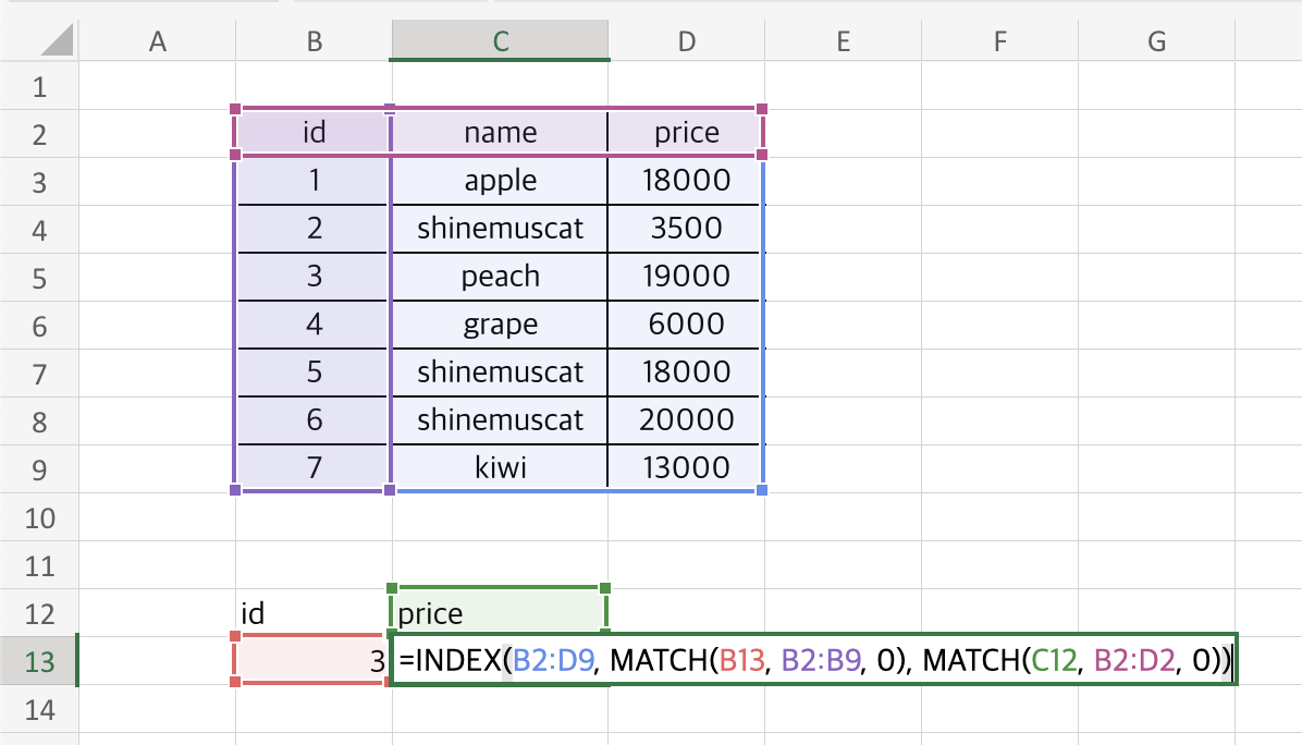 B2:D9 범위 안에서 첫 번째 행, 첫 번째 컬럼 위치는 바로 B2 셀이 되므로 B2 셀에 있는 값인 id라는 값을 return하는 것이죠.