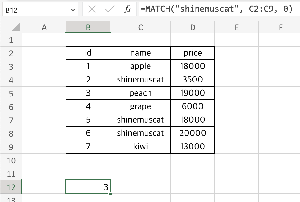 C4 셀의 shinemuscat이라는 값은 C2:C9 범위에서 3번째에 있는 값이므로 3이 return됩니다.