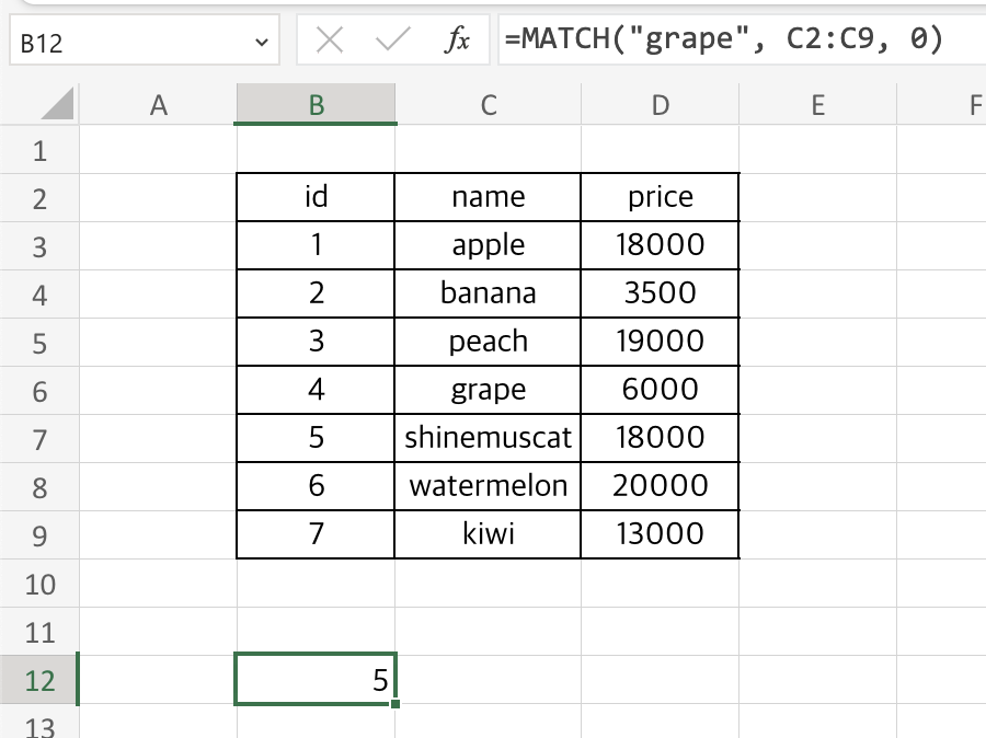 C2:C9 범위 내에서 grape랑 정확히 일치하는 값을 찾으면 5번째에 있으므로 5가 return됩니다.