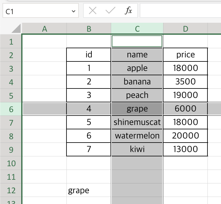 C4, C7, C8 셀에 shinemuscat이라는 값이 있죠.