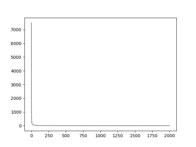 matplotlib를 이용해 y = 1500 / x 그래프를 x = 0 ~ 2000 구간에서 그리면 위와 같습니다.