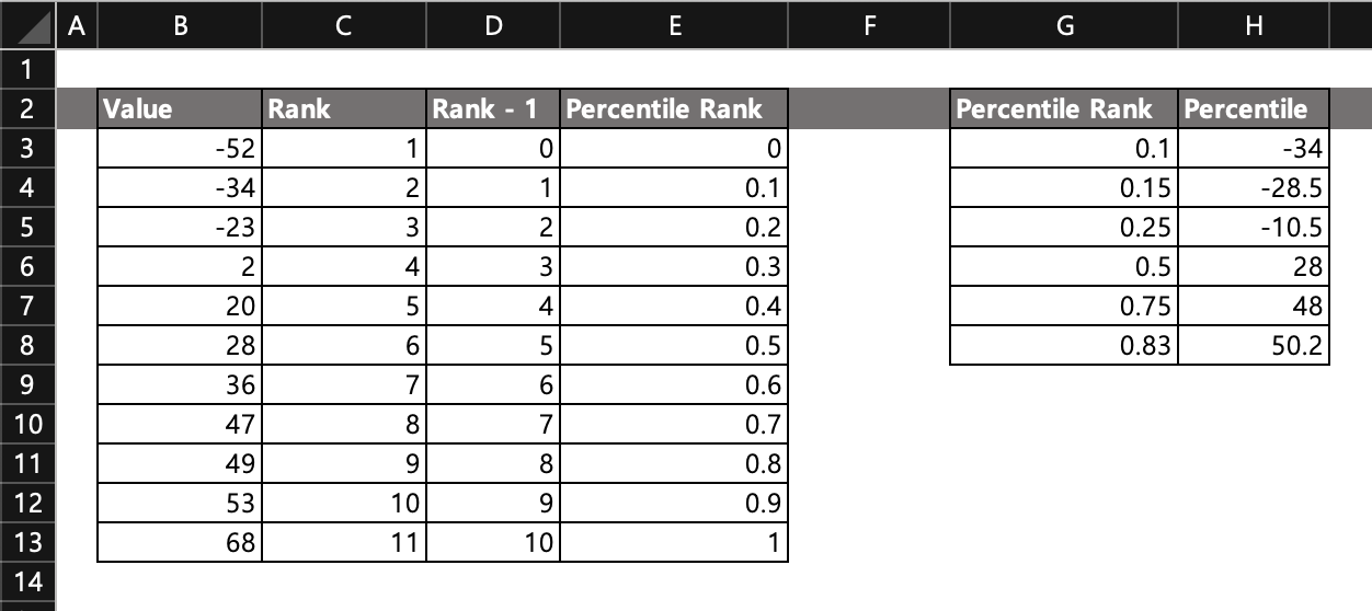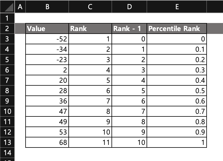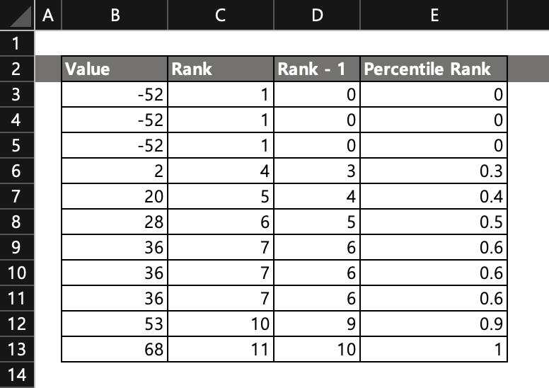 Percentile Rank = (Rank - 1) / (Value Count - 1)