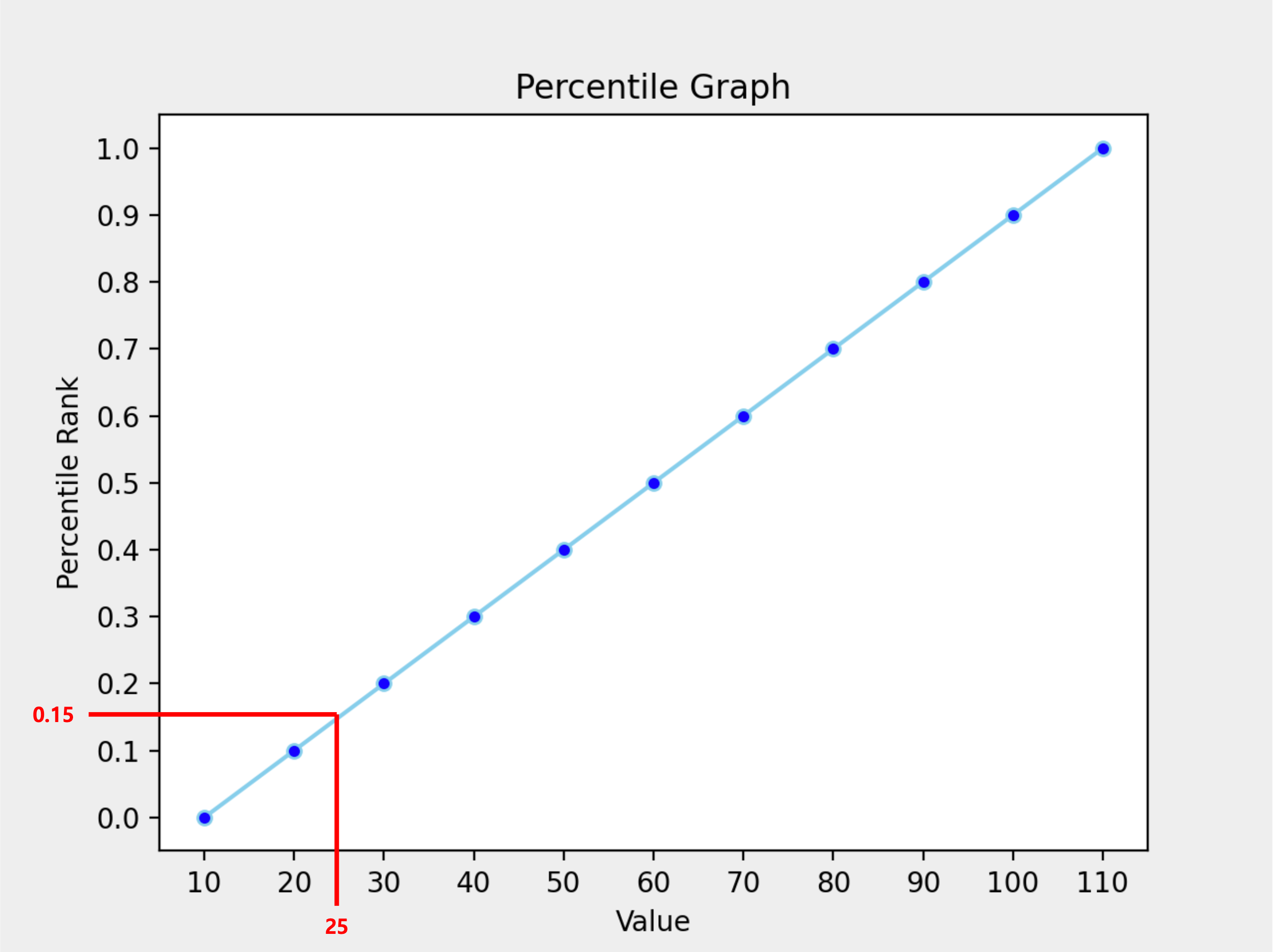 즉, Value 컬럼에 있는 11개의 값들을 기준으로 0% ~ 100%의 위치를 매겼을 때 15% 위치에 있는 값은 25라는 것입니다.