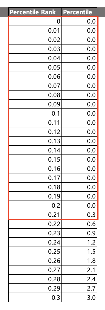 가장 첫 3개의 값이 모두 0으로 동일했고, 그 다음 Value = 3의 백분위가 0.3이므로 0~0.2까지는 모두 백분위수가 0이 됩니다.