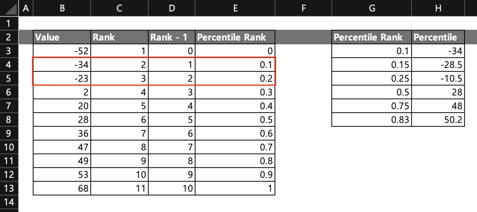근데 Value를 기준으로 계산된 Percentile Rank를 보면 15%라는 위치는 존재하지 않습니다.