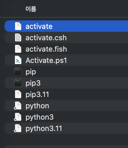 아까 가상환경이 설치된 곳을 가보면 bin이라는 폴더가 있었습니다.